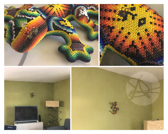 Look close, can you see? This gecko from Puerto Vallarta. Hand made by artisans. Brought home carefully and lovingly because it reminded us so much of life down where lizards live. Geckos running up the walls, hanging out in their charming way. Well, they charmed me anyways. Which is why this little guy got his own wall... as if he was climbing his way to hide in the rafters. He's been there for a good 5 years. Adding colour to our home and making me happy every time I look at him.